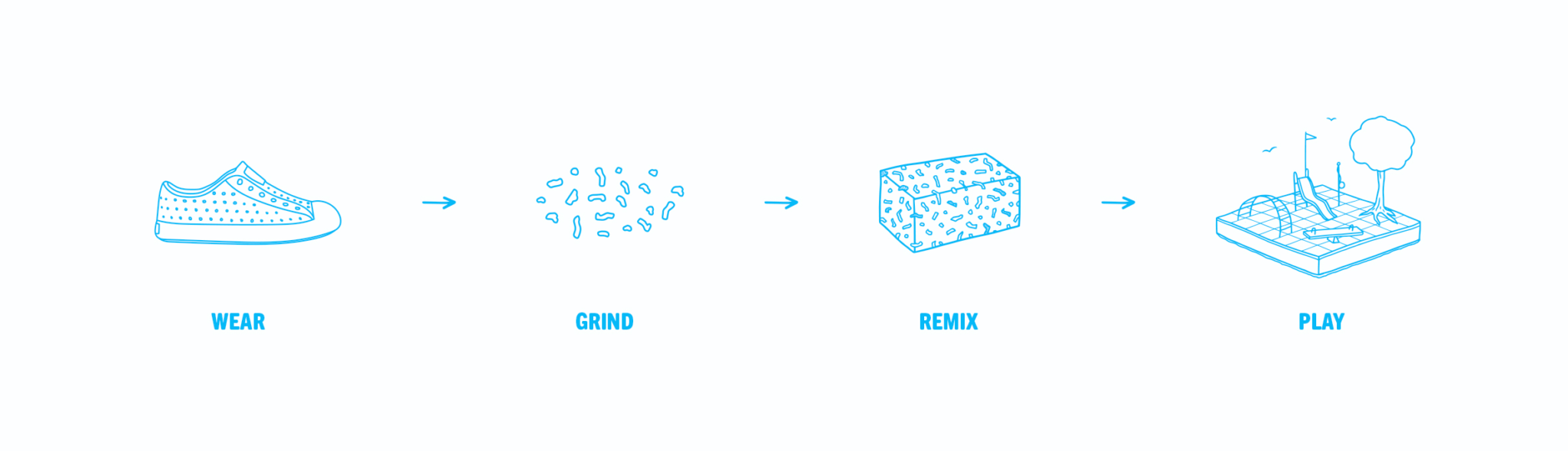 В 2023 году бренд перешел на 100% переработку и вторичное производство своей обуви. В рамках инициативы The Remix Project компания будет воплощать в жизнь проекты по строительству детских площадок, используя для этого переработанную обувь бренда.
